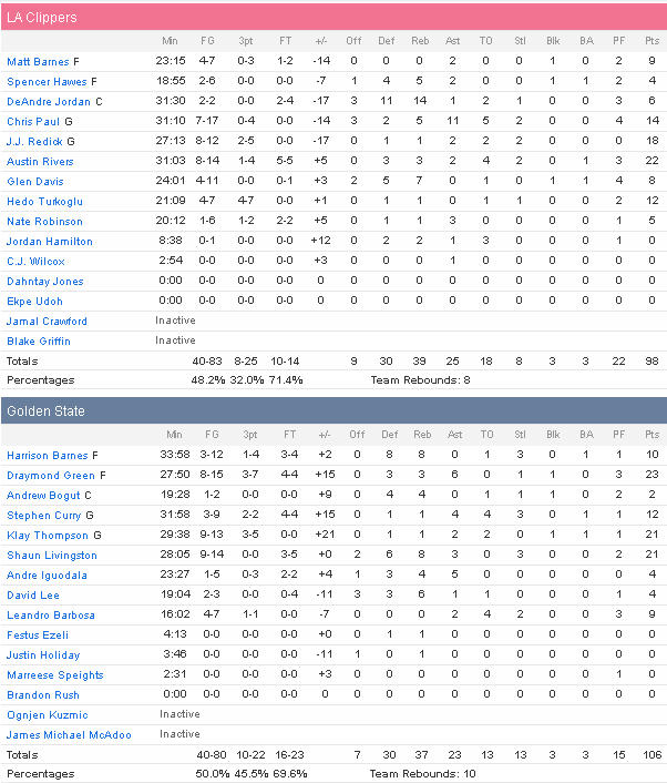 Golden State a été mené par le trio Draymond Green (23 points à 8/15 et 6 passes en 28 minutes), Klay Thompson (21 points à 9/13) et Shaun Livingston (21 points à 9/14). Malgré un match discret de Stephen Curry (12 points à 3/9, 4 passes, 3 ballons perdus et 4 interceptions), les Warriors ont fini par s’envoler entre la fin du second quart et le début du troisième. En face au premier coup de mou les Clippers ont été définitivement lâchés, laissant Golden State shooter à 50% et perdant bien trop de ballons après la pause (18 dont 8 en 3ème quart). Chris Paul termine avec 14 points à 7/17, 11 passes et 5 ballons perdus. JJ Redick est le meilleur Clipper avec 18 points à 8/12 alors qu’Austin Rivers en ajoute 22 et DeAndre Jordan capte 14 rebonds et met fin à sa série à au moins 15 prises.