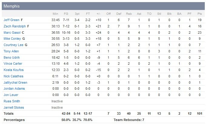 Marc Gasol inscrit 15 points durant le troisième quart mais les Bulls se reprennent dans le dernier quart-temps et parviennent à égalisé à 82 partout sur un dunk après interception de Tony Snell (21 points), à 7″10 de la fin du match. Chicago prendra ainsi jusqu’à 4 points d’avance mais Memphis a gardé son sang-froid pour retrouver l’avantage 95-88 à 2″04 quand les Bulls prennent une technique pour avoir placé 6 joueurs sur le terrain. À noter que Vince Carter a poursuivi sur sa bonne dynamique pour son 3e match après 14 matchs d’absence et une déchirure au pied droit. Il inscrit 9 points en 13 minutes. Depuis l’arrivée de Jeff Green dans la rotation des Grizzlies, ces derniers comptent 16 victoires pour 6 défaites.