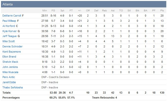 Atlanta est devenue la première équipe à atteindre les 50 victoires cette saison avec un succès 130-105 marquant le plus grand nombre de points inscrits par les Hawks pour 2014-15. Kyle Korver (6/8 à 3-points) et DeMarrre Carroll se partagent le titre de meilleur marqueur de l’équipe alors que Jeff Teague signe 18 points à 7/11 et 13 passes en bon meneur de jeu et dans une équipe qui va délivrer 42 assists durant la rencontre !