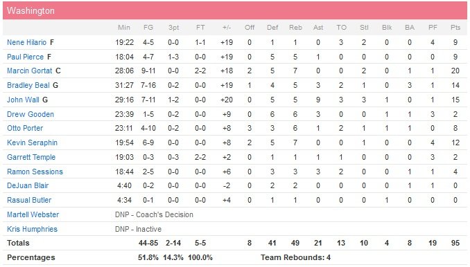 Washington fait tomber la pluie avec un 12/13 sur les 6 minutes et demi suivantes pour mener 26-15 sur un dunk de Nene à 5″25. Le score est de 36-21 à la fin des 12 premières minutes et la marge continue de croître, atteignant les 19 points en début de deuxième quart, puis 42-23 sur un shoot de Seraphin à 9″26. Les Hornets vont alors passer un 8-0 à leurs adversaires pour réduire l’écart à 42-31 à 7″09. Washington se reconstruit une belle avance 56-39 à 1″50 mais les Hornets rentrent 7 lancers sur 8 dans les dernières 91 secondes et sont finalement revenus à 10 points à la mi-temps, 56-46. Charlotte reviendra maximum à 8 points dans les premières secondes du troisième quart-temps mais les Wizards leur passent un 13-6 et le score est de 69-54 sur un 3-points de Paul Pierce à 5″32. Les Hornets ne passeront ensuite pas en-dessous de la barre des 15 points.