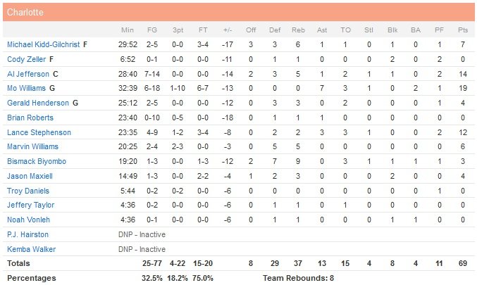 Mo Williams a lui mené les Hornets avec 19 points et 7 passes mais son équipe shoote à 35% (25/77) et perd 16 ballons dans le match pour atteindre son plus petit score de la saison (à égalité) tout en mettant un terme à une série de 5 victoires. Al Jefferson marque 14 points et Lance Stephenson 12 pour Charlotte, qui aura mené deux fois au score dans les deux premières minutes et demi du match (9-8 à 9″21 de la fin du premier quart) avant de laisser ses adversaires faire la course en tête.