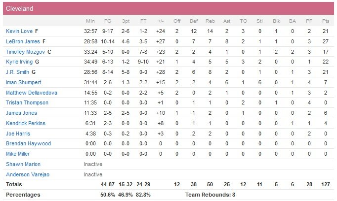 L’ailier était loin d’être le seul à avoir brillé dans ce match, qui a vu trois autres joueurs dépasser la barre des 20 points pour Cleveland. Kevin Love, avec 21 points à 9/17 et 14 rebonds, Kyrie Irving avec 22 points à 6/13 5 rebonds et 5 passes et enfin J.R. Smith avec 21 points à 8/14, 8 rebonds et 2 passes. Cleveland met ainsi fin à une série de 14 défaites consécutives à l’American Airlines Center. Chandler Parsons termine meilleur marqueur des Mavericks avec 18 points, Monta Ellis suit avec 17, Amar’e Stoudemire 15 et Dirk Nowitzki est limité à 13 points à 3/10.