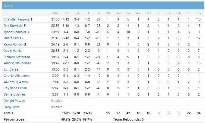 Secoués en premier quart-temps (remporté 31-26 par Dallas), les Cavaliers se reprennent avec deux trois-points consécutifs de James, qui bat le record de passes (avec 4207 passes en carrière à ce moment du match) de Mark Price quelques instants plus tard sur une passe à James Jones pour le 3-points qui égalise à 35 partout à deux minutes de la fin de la période. James avait retiré son bandeau pour la première fois dans le deuxième quart-temps d’un match contre Phoenix et ne l’a plus remis depuis. Cleveland (41V-25D) rentre 10 trois-points de plus que ses adversaires dans cette rencontre et mène 39-38 après une interception d’Iman Shumpert pour le layup de James en transition. À la pause, Dallas (41V-25D) est mené 67-53 et cela n’ira que de mal en pis avec 32 points encaissés dans le troisième quart-temps et 28 dans les 12 dernières minutes.