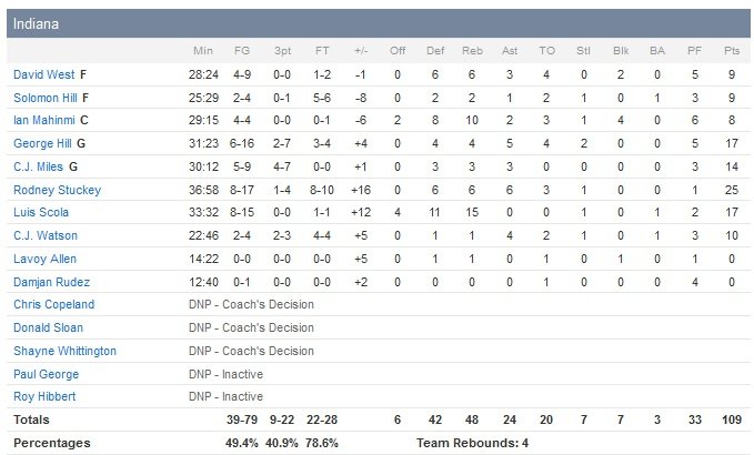 David West donne 5 points d’avance à son équipe à 2″45 mais Indiana ne va pas réussir à tuer le match à temps et ne marquera ensuite plus aucun panier jusqu’à la fin du temps réglementaire. Ersan Ilyasova en profite pour marquer 5 points dans les deux dernières minutes et envoyer le match en prolongation. Menés de deux points en début d’OT, les Pacers passent un 9-0 à leurs adversaires pour mener 105-98. George Hill scelle la victoire pas si facile des siens sur la ligne des lancers-francs à 16 secondes du buzzer et porte l’écart à 6 points. À noter l’absence de Roy Hibbert en raison d’une infection au coude gauche. Ian Mahinmi était donc titulaire. Le Français termine à 10 points et 8 rebonds mais a été éjecté pour 6 fautes après avoir pris une flagrante 1 en prolongation.