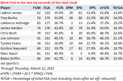 Voici ce que ça donne pour les joueurs qui shootent le plus en fin de possession et il n’y a pas vraiment de surprise si ce n’est peut-être la présence de Trey Burke en seconde position.