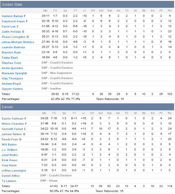 Nouvelle victoire pour les Nuggets de Melvn Hunt, qui se payent la meilleure équipe de la ligue 114-103 au Pepsi Center. Mais la tâche leur a été facilité par la mise au repos des cadres des Warriors (Curry, Thompson, Bogut et Iguodala).