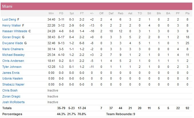 DeRozan et Johnson marque chacun 6 points dans le troisième quart et Miami prend l’eau, 78-63, avant de jouer le dernier quart. À noter que pour son retour après un match de suspension, Hassan Whiteside a signé 9 points et 12 rebonds. Son équipe a souffert de loin avec un 0/9 à 3-points pour débuter la rencontre. Wade sera le premier joueur du Heat (5/23) à rentrer un tir primé, à 1″38 de la fin de la première mi-temps.