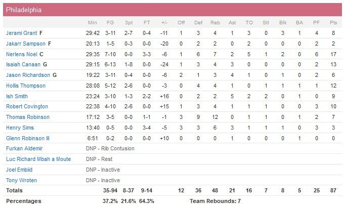 Joe Johnson ajoute 15 points et Jarrett Jack 12 dans un match où les Nets se sont repris défensivement après avoir laissé leurs adversaires marquer 106.6 points par match sur ses 5 dernières rencontres. Les Sixers ne shooteront qu’à 30.2% et 11.1% à 3-points après la mi-temps (8/37 sur le match). Nerlens Noel est l’homme du match pour les locaux avec 17 points à 7/10, 7 rebonds et 2 contres mais aussi 5 ballons perdus et 6 fautes.