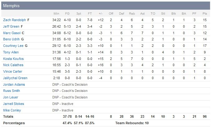 Jeff Green et Zach Randolph signent 15 points chacun, Beno Udrih, remplaçant de Mike Conley (cheville), marque 14 points et Marc Gasol termine à 12 points, 7 rebonds et 7 passes pour mettre fin à une série de deux défaites. Avec des arrières efficaces à l’extérieur (8/14 à 3-points), les Grizzlies ont pu se créer de la place à l’intérieur. Giannis Antetokounmpo termine lui meilleur marqueur des Bucks avec 19 points à 7/10. Trois de ses coéquipiers dépassent également les 10 points mais Milwaukee s’incline pour la deuxième fois d’affilée et pour la 9e fois en 12 rencontres.