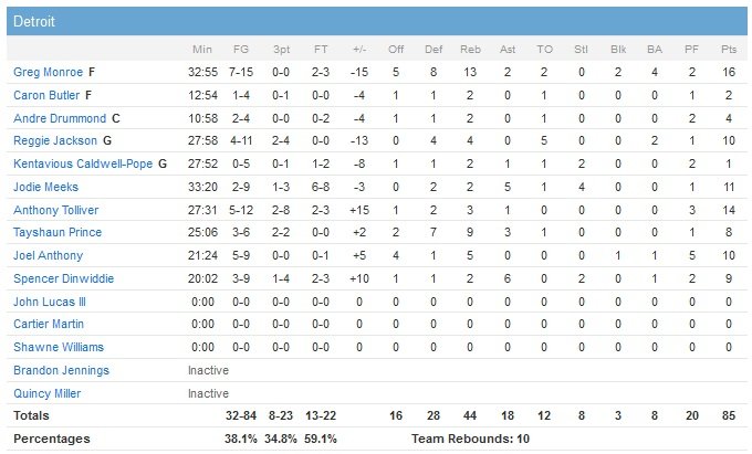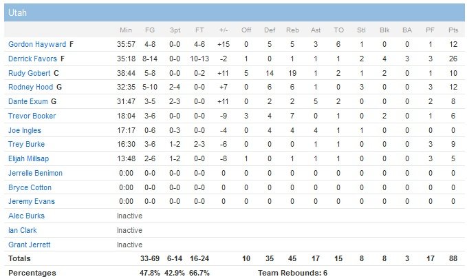 Le Jazz shoote à 70% dans ce deuxième quart grâce à une excellente adresse à 3-points et un Favors qui marque 8 points dans la période. Le troisième quart-temps est un gros passage à vide pour les deux équipes, qui bouclent ces 12 minutes sur le score de 13 à 12 en faveur d’Utah… Detroit réalise en revanche une grosse fin de match en inscrivant 30 points dans le quatrième. L’équipe de Stan Van Gundy s’approchera à 86-83 à 37 secondes du buzzer mais Trey Burke (9 points) rentre un shoot avec la planche décisif à 13.1 secondes.