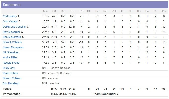 Un 3-points de Wall réduit l’écart à 85-84 après trois quarts-temps. .Butler marque 5 points consécutifs (94-88) et un nouveau 3-points de Wall vient conclure un 16-0. Coéquipier de Wall (20 points et 10 passes en seconde mi-temps) à Kentucky il y a maintenant quelques années, DeMarcus Cousins signe 30 points à 9/17, 6 rebonds et 5 passes, dans un match joué sans Rudy Gay (genou). Les Wizards jouaient quant à eux pour la deuxième fois d’affilée sans Nene (raisons personnelles). Les Kings concluent leur road trip sur un bilan de 2 victoires pour 6 défaites.