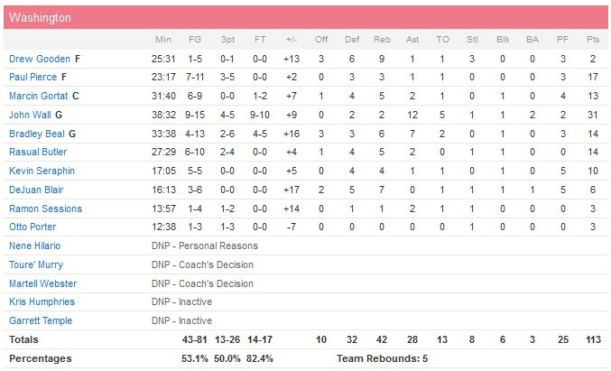 Menés 64-46 à la pause, les Wizards ont pris un savon de leur coach Randy Wittman dans les vestiaires. Ils vont ensuite shooter à 61% en deuxième mi-temps et termineront à 13/26 derrière la ligne à 3-points pour remporter un 5e match en 7 rencontres. Rasual Butler et Bradley Beal ajoutent 14 points chacun et Washington prend pour la première fois du match l’avantage sur un 3-points de Ramon Sessions, 89-88 à 10″11 de la fin du match. Avant cela Washington passe un 19-2 à ses adversaires pour revenir à 79-77 à 2″45 de la fin du troisième quart.