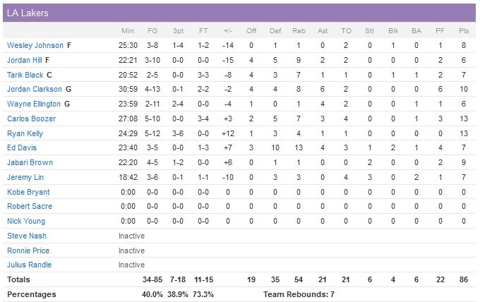 Sans Jeff Teague, DeMarre Carroll et Paul Millsap (laissés au repos par Mike Budenholzer), les Hawks n’ont pas eu à forcer pour s’imposer 91-86 sur le parquet des Lakers cette nuit. Dennis Schröder fait le boulot avec 24 ponts et 10 passes et Al Horford ajoute 21 points face à des Lakers en terrible manque de leader et dont les deux meilleurs marqueurs sont Carlos Boozer et Ryan Kelly avec 13 points chacun.