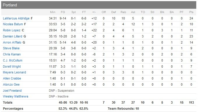 Beaucoup de fans avaient déjà quitté la salle dans le quatrième quart-temps, voyant leur équipe menée de 18 points. Derrière 93-79 après un layup de Chris Kaman pour démarrer les 12 dernières minutes, Toronto revient à 8 points après un 6-0. Un temps-mort de Terry Stotts plus tard, les Blazers répondent par un 8-0 incluant un 3-points d’Afflalo et deux dunks consécutifs de Dorell Wright, l’affaire est dans le sac. Les Raptors n’ont plus battu Portland depuis une victoire à domicile le 2 janvier 2013 (102-79).