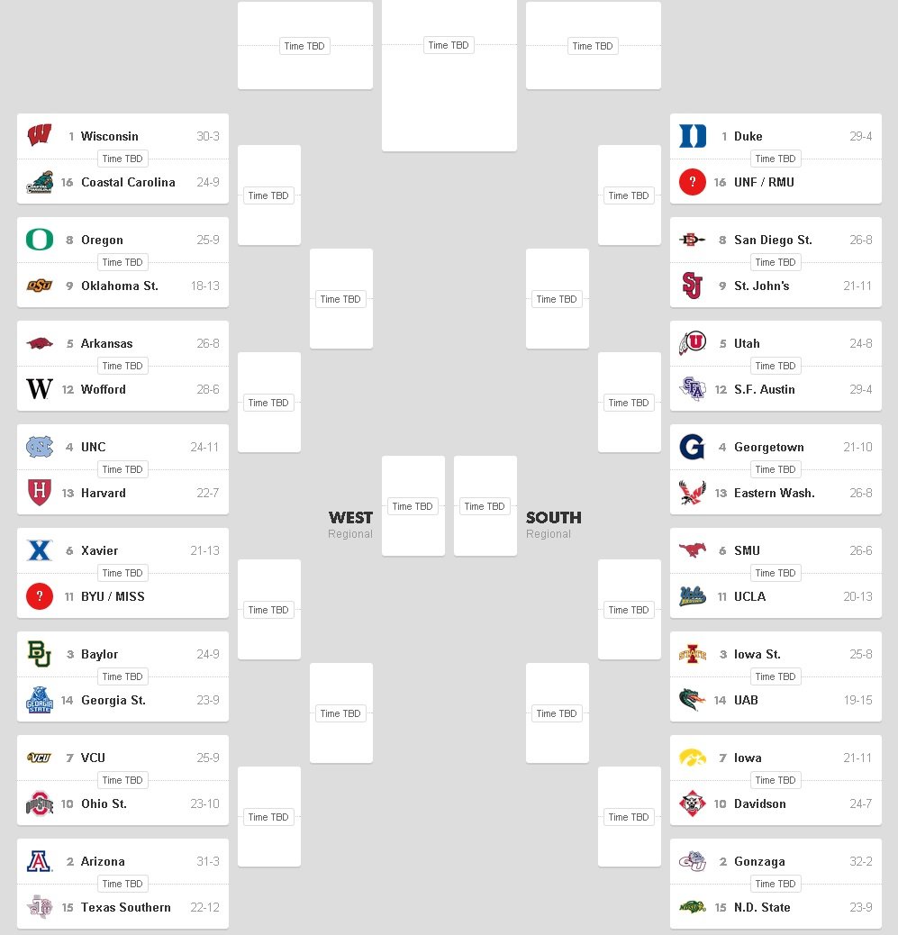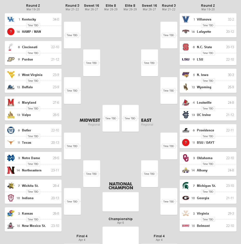 Voilà on connait le bracket pour le tournoi final NCAA qui débutera dès demain par l’Opering Round, sorte de tour préliminaire où 4 équipes gagneront leur billet pour le Round 2. Les 4 premières têtes de série pour chaque série sont Kentucky, Villanova, Wisconsin et Duke. Kentucky, toujours invaincu cette saison part comme très grand favori.