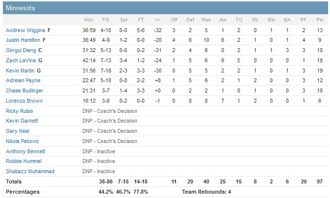 Avec seulement 8 joueurs disponibles (douleur à la cheville droite pour Ricky Rubio, genou douloureux pour Kevin Garnett et également cheville douloureuse pour Nikola Pekovic), les Wolves se sont reposés sur Kevin Martin (19 points), Zach LaVine (18 points) et Andrew Wiggins (13 points). La défense de Leonard sur Wiggins joue un grand rôle dans le 13-0 infligé par les Spurs en milieu de troisième quart-temps à leurs adversaires et San Antonio (33-13 dans la période) prend ainsi le large 86-56.