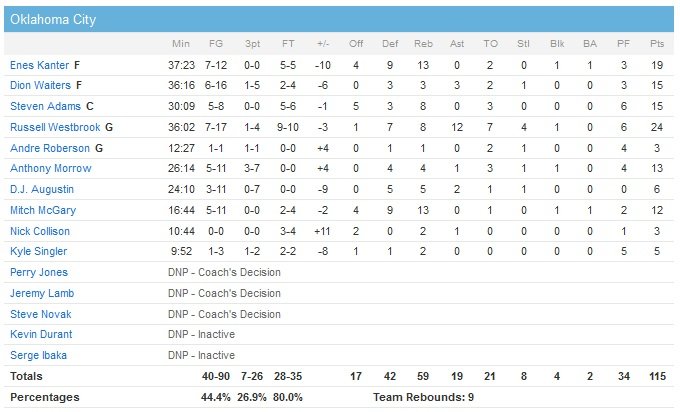 Parsons donne 4 points d’avance à son équipe avant que Westbrook (4 interceptions et 7 ballons perdus) ne commette une faute offensive qu’il ne manquera pas de contester. Le meneur se reprend rapidement et prend sa 6e faute dans la foulée alors qu’il tentait d’intercepter sur une remise en jeu. À noter le double-double de Rajon Rondo avec 11 points et 13 passes (son premier dans ces deux catégories depuis le 22 décembre dernier). Monta Ellis termine lui à 24 points et rentre 4 lancers-francs dans les dernières 31 secondes du match après en avoir raté deux sur la ligne et donner un espoir finalement vain à ses adversaires.