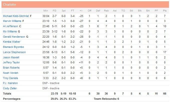 Les hommes de Quin Snyder ont mis le feu en première mi-temps avec 61 points inscrits (record de la saison pour eux) et un 12/15 (15/24 sur la rencontre) à 3-points (record du plus grand nombre de 3-points inscrits en une mi-temps pour Utah) et mènent de 14 points après 12 minutes de jeu, puis 61-30 à la pause. Gordon Hayward ajoute 18 points face à des Hornets limités à un triste 29.5% de réussite et menés par les 17 points de Lance Stephenson. Al Jefferson a lui été parfaitement neutralisé et termine à 10 points à 5/11 et 7 rebonds, même s’il fait mieux que le 1/5 de Marvin Williams, le 2/7 de Michael Kidd-Gilchrist, le 1/6 de Gerald Henderson ou encore le 3/12 de Mo Williams.