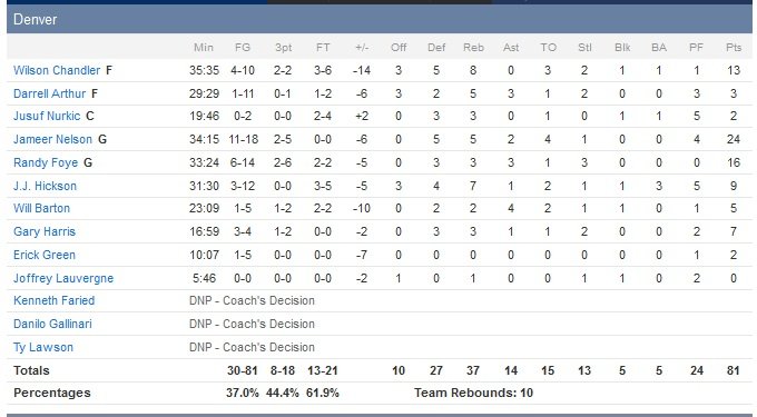 Jameer Nelson a été l’homme du match pour Denver avec 24 points à 11/18, bien aidé par son collègue Randy Foye (16 points). La série des Nuggets (4 victoires) prend fin, un jour après une victoire en double-prolongation face aux Pelicans. Melvin Hunt avait d’ailleurs choisi de laisser Ty Lawson (leader aux passes), Kenneth Faried (leader au rebond) et Danilo Gallinari au repos pour ce match (les trois apportent en moyenne 38.6 points par match). Memphis domine donc logiquement dans la peinture (46 points à 30 dans la raquette et un avantage 57-37 au rebond) même si Denver va s’accrocher grâce à son adresse extérieure (8/18 derrière la ligne à 3-points). La première mi-temps est marquée par un manque d’adresse et beaucoup de ballons perdus pour les deux équipes (10 pour Denver, 13 pour Memphis).