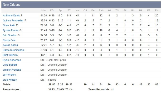 Quincy Pondexter rentre 5 trois-points dans le match et termine à 18 points pendant qu’Omer Asik signe 16 points et 11 rebonds mais le banc des Pelicans devra attendre qu’il reste 1″43 à jouer (panier d’Alexis Ajinça) dans le troisième quart-temps pour inscrire ses premiers points du match. Norris Cole enchaîne ensuite avec un 3-points et New Orleans conclut son troisième quart sur un 7-0 pour mener 70-62. L’équipe retombe dans ses travers avec un 4/20 dans le dernier quart-temps, laissant Milwaukee égaliser à 80 partout sur une claquette de Zaza Pachulia à 2″17. Eric Gordon, jusque-là pas en réussite, répond avec un 3-points clutch. Davis rentre ensuite un autre shoot important à 5m du panier, donnant trois points d’avance aux siens 85-82 à 1″07. Ce petit écart tiendra finalement jusqu’à la fin, les Pelicans retenant leur souffle sur une tentative lointaine d’Ersan Ilyasova alors que la sirène retentit.