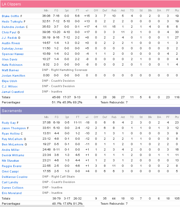 En troisième acte les Clippers ont fait le premier mini-break à la faveur d’un 11-4 pour mener 69-62 puis 76-66 suite à un 7-0. Finalement à l’entame du dernier quart les hommes de Doc Rivers menaient 80-73 mais le trio Reggie Evans, Andre Miller (16 points) et Derrick Williams (11 points) a ramené les Kings très rapidement sur un 11-4, 84-84 à 9 minutes de la fin. LA a alors entamé son festival derrière la ligne à trois points. En 3’30 Redick en a inscrit 2, Turkoglu 2 et Chris Paul 1, résultat un 18-6 pour les Clippers qui les a mis devant 102-90, pliant définitivement le match.