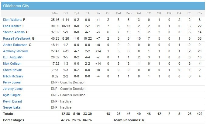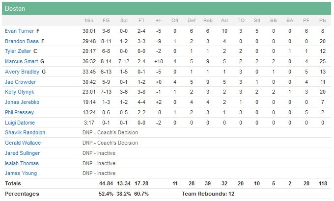Ancien joueur de l’université d’Oklahoma State, Marcus Smart a battu son record de points en carrière avec 25 unités alors que ses coéquipiers Kelly Olynyk et Brandon Bass l’ont bien épaulé avec 20 points chacun. Le Thunder n’avait jamais laissé un adversaire réussir autant de shoots dans une mi-temps que lors des deux premiers quarts de cette rencontre. Boston shoote ainsi à 64% en première mi-temps. L’équipe de Brad Stevens sera ensuite limitée à un 42% de réussite après la pause. Boston fait la course en tête 57-53 après deux quarts-temps grâce à 14 points de Smart et 12 de Tyler Zeller. Pendant ce temps, Westbrook marque 11 points à 4/11.