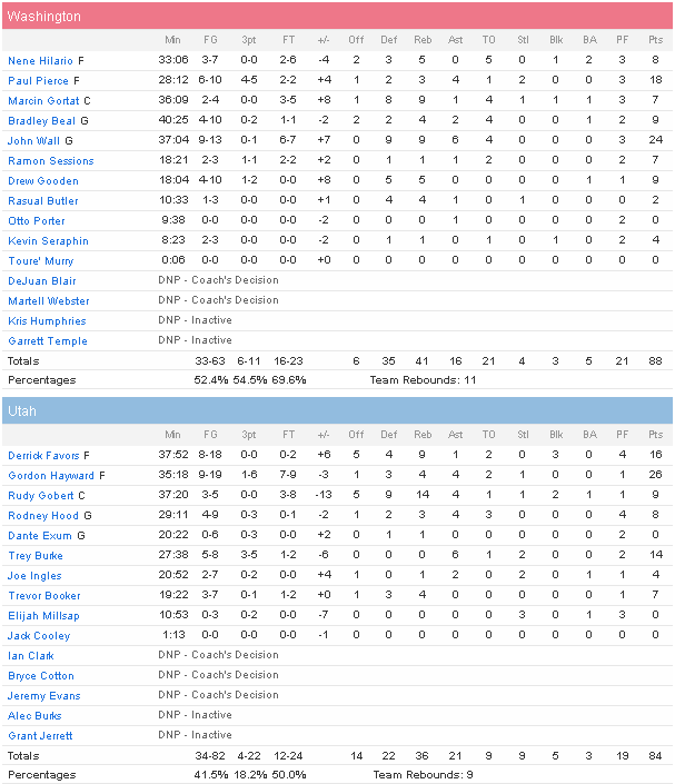 C’est le duo John Wall (24 points, 9 rebonds et 6 passes) – Paul Pierce (18 points à 6/10) qui a mené Washington, qui a réussi à mettre en difficulté la défense du Jazz en shootant à un excellent 52.4% dont un 6/11 à trois points. Mais avec leur 21 ballons perdus ils se sont un peu compliqués la tâche. Avec seulement 41.5% aux tirs, le Jazz a lui compter sur sa présence aux rebonds offensifs avec 14 prises dont 10 pour le duo Derrick Favors (16 points et 9 rebonds) – Rudy Gobert (9 points, 14 rebonds, 4 passes et 2 contres). Gordon Hayward marque lui 26 points et Trey Burke 14 mais ils n’ont pu faire passer les leurs devant en fin de match.