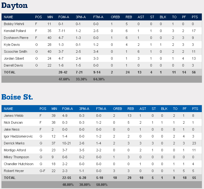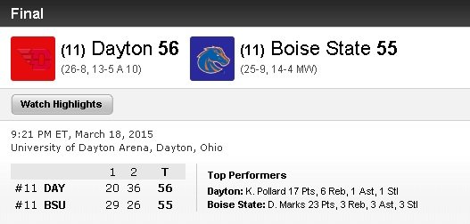 On connait les deux dernières équipes qualifiées pour le Second Round. Hier soir lors du First Four, Dayton a disposé au finish de Boise State 56-55 grâce à un shoot clutch de Jordan Sibert et une absence de coup de sifflet litigieux en fin de rencontre.