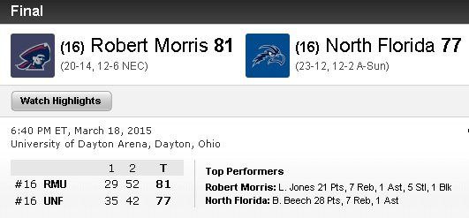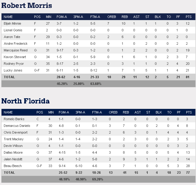Dans l’autre rencontre c’est Robert Morris qui s’impose face à North Florida grâce au trio Lucky Jones (21 points), Rodney Pryor (20 points) et Marcquise Reed (19 points).