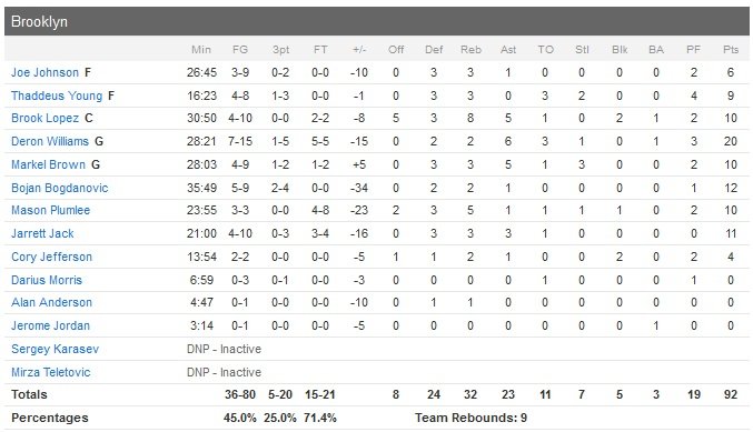 Le début de match est très laborieux pour les Cavaliers, qui sont menés de 13 points à la fin du premier quart-temps, avant de passer un 30-8 à leurs adversaires pour ne plus jamais regarder en arrière. Deron Williams mène lui les Nets avec 20 points et 6 passes mais son équipe commence à être à court de matchs pour continuer à croire aux playoffs. Brooklyn mène ainsi 22-9 (6 ballons perdus des Cavs en début de match) dans le premier quart avant que Smith n’inscrive quatre 3-points et 14 points dans le deuxième quart pour Cleveland (7/9 de loin dans le deuxième), qui prend l’avantage 36-21 dans la période.