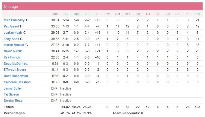 Sans Jimmy Butler, Derrick Rose et Taj Gibson, les Bulls se maintiennent à la 4e place de la Conférence Est avec 41 victoires pour 28 défaites. Solomon Hill est lui le meilleur marqueur d’Indiana (qui compte 6 joueurs à au moins 10 points) avec 13 points. Les deux équipes sont désormais à deux victoires pour deux défaites l’une contre l’autre cette saison. Lors des trois dernières confrontations, les Pacers avaient tenu les Bulls à 88.7 points de moyenne à seulement 37.5% de réussite. Des chiffres bien différents cette nuit avec 51 points marqués par Chicago en première mi-temps et 103 au final, le tout à 41.5% aux tirs. Dunleavy met le feu avec 10 points durant un 14-2 en faveur des locaux dans le deuxième quart et les Bulls transforment un avantage d’un point en un de 12, 47-35, à trois minutes de la mi-temps. Chicago est finalement devant 51-41 à la pause.