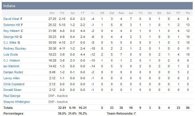 L’équipe de Tom Thibodeau mène 59-46 en début de troisième mais Joakim Noah prend 3 fautes en 23 secondes et est condamné à rester sur le banc pour le reste du quart-temps. Indiana en profite pour se relancer avec un 9-0 et revenir à 59-55. Les Pacers reviendront au maximum à trois points 69-66 à deux minutes de la fin mais les Bulls terminent leur troisième quart sur un 7-2 qui porte le score à 76-68. Le début de quatrième quart est également dominé par les Bulls, qui infligent un petit 6-2 à leurs adversaires (82-70), qui ne reviendront plus à moins de 6 points.