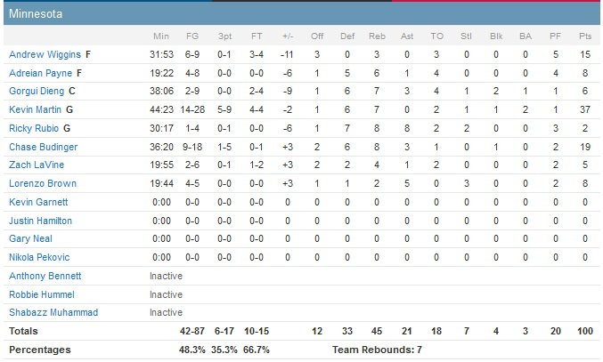 De retour après deux matchs d’absence (cheville droite douloureuse), Ricky Rubio termine à 2 points à 1/4, 8 passes et 8 rebonds en 30 minutes de jeu alors que son coéquipier Wiggins (6 points dans le dernier quart) est gêné par les fautes en première mi-temps. Chase Budinger maintient néanmoins l’espoir quasiment jusqu’au bout pour les Wolves, qui ne sont qu’à deux points 98-96 à 2″44 de la fin du match. DeRozan lui répond avec un jump shot puis Amir Johnson intercepte dans les mains de Rubio avant de trouver Lou Williams pour le layup, 102-96 à 1″27. Gorgui Dieng enchaîne avec un layup mais Greivis Vasquez va définitivement sceller le sort du match avec un 3-points réussi à 55 secondes décisif.