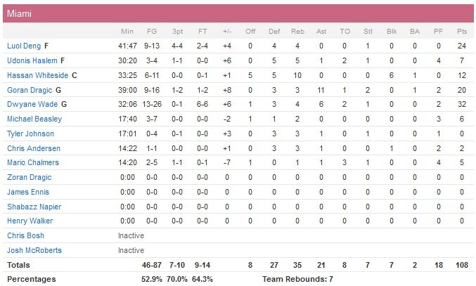 Il shoote à 13/26 dans un match où Miami était mené de 11 points peu après la mi-temps. Luol Deng a lui été très propre avec 25 points à 4/4 à 3-points. Goran Dragic n’est pas en reste avec 20 points et 11 passes alors qu’Hassan Whiteside apporte 12 points et 10 rebonds. En face LaMarcus Aldridge fait du LaMarcus Aldridge avec 34 points et 12 rebonds et est suvi au scoring par Damian Lillard (17) et Arron Afflalo (15) mais Portland tombe à la 4e place de la Conférence Ouest derrière Houston après cette deuxième défaite consécutive. Miami se relance avec 10 passes sur 13 paniers inscrits dans le troisième quart, avec 7 joueurs différents participant au scoring (5/5 à 3-points) et recolle à 81-79 avant de jouer le dernier quart. Deng démarre les 12 dernières minutes avec un nouveau 3-points et Miami récupère l’avantage pour la première fois depuis les premières minutes du match. À 5″40 de la fin du match, Miami compte 8 points d’avance mais cela laisse encore du temps à Portland.