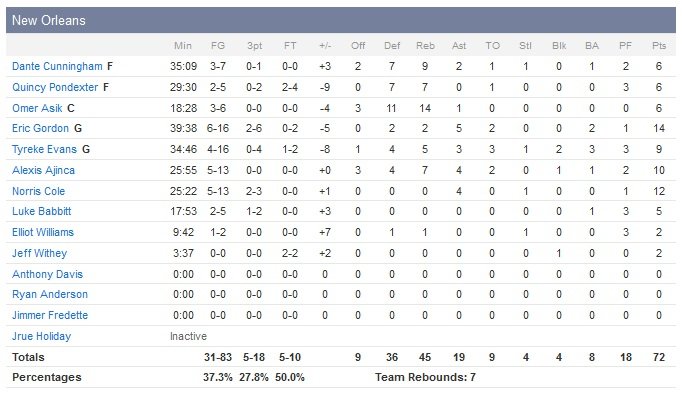À noter la blessure au mollet d’Omer Asik (14 rebonds) dans le troisième quart-temps. Ajinça termine à 10 points à 5/13, 7 rebonds et 4 passes en 25 minutes de jeu. Prochain match à Houston demain pour les Suns. New Orleans sera de son côté chez les Warriors.