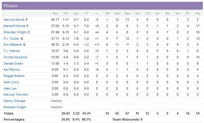 Phoenix fait la course en tête quasiment tout le match et va compter 11 points d’avance deux fois dans le troisième quart-temps. Les Pelicans leur passent un 8-0 pour finalement revenir à 55-53 avant de jouer le dernier quart. Ils finiront même par passer devant 6664 sur un long shoot de Norris Cole à 6 minutes de la fin. Markieff Morris fait un sur deux sur la lign, son frère trouve Wright pour le alley oop et cela redonne trois points d’avance aux locaux. Une claquette dunk de Wright porte ensuite le score à 71-66 à 2″45 du buzzer. Cole rentre alors un 3-points pour réduire une nouvelle fois l’écart (71-69) à 1″54. Ligne de fond, Markieff Morris rentre un shoot en début de dernière période, 73-69. Son frère rate ensuite son 7e shoot de loin de la soirée et offre une chance aux Pelicans de prendre l’avantage. Alexis Ajinça manque sa chance à l’intérieur, Tucker prend le rebond, rentre un lancer sur deux à 2.6 secondes du terme et Tyreke Evans ne parvient pas à trouver un shoot digne de ce nom avant la sirène.