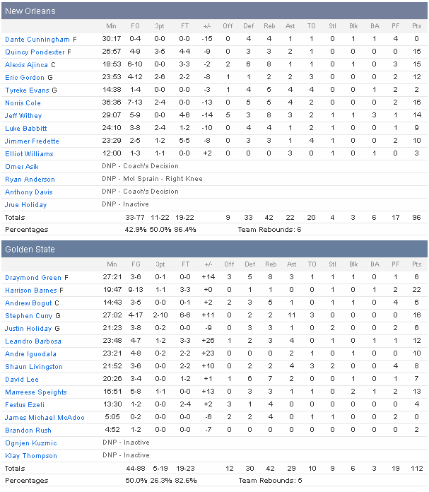 Pourtant les Warriors étaient sans Klay Thompson et Stephen Curry a connu une soirée compliquée avec son shoot, compilant 16 points à 4/17 (il a raté 12 de ses 13 premiers tirs) et 11 passes. Mais Harrison Barnes (22 points) a encore réalisé un excellent match. Le banc fait encore son boulot avec 13 points pour Marreese Speights, 12 pour Leandro Barbosa et 10 pour Andre Iguodala. Le collectif des Warriors a mis à mal la défense des Pelicans avec un joli 50% aux tirs et 56% sans compter Steph Curry, pas dans un bon jour. Les Pelicans sont eux tombés sur une défense toujours aussi en place et ont été limités à 42.9% et ont perdu pas moins de 20 ballons, se rendant la tâche impossible malgré un bon Alexis Ajinça (15 points à 6/10 et 8 rebonds en 19 minutes). Norris Cole ajoute 16 points en sortie de banc, Quincy Podexter 15, mais les titulaires n’ont pas été en réussite. Tyreke Evans a en plus dû abandonner ses coéquipiers après la pause, blessé au mollet.
