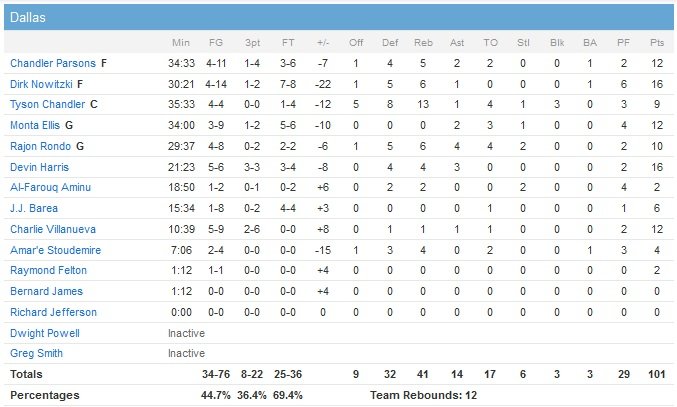 Les Mavericks sauveront l’honneur en revenant à 9 points en fin de quatrième quart-temps (ils ont pris jusqu’à 24 points de retard) mais la réussite insolente de leurs adversaires (64.7% aux tirs pour Memphis en seconde mi-temps avec un 22/34) les maintient sous l’eau. Dirk Nowitzki (6 fautes) et Devin Harris sont les meilleurs scoreurs de Dallas avec 16 points chacun alors que Monta Ellis (12 ponts) n’a pas rentré de panier avant le dernier quart. Pour son retour après 4 matchs d’absence (cheville), Mike Conley signe 14 points et 3 passes en 26 minutes.