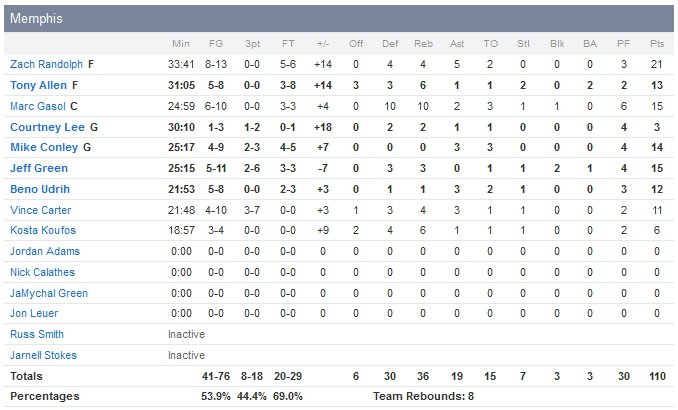 Les Mavericks sauveront l’honneur en revenant à 9 points en fin de quatrième quart-temps (ils ont pris jusqu’à 24 points de retard) mais la réussite insolente de leurs adversaires (64.7% aux tirs pour Memphis en seconde mi-temps avec un 22/34) les maintient sous l’eau. Dirk Nowitzki (6 fautes) et Devin Harris sont les meilleurs scoreurs de Dallas avec 16 points chacun alors que Monta Ellis (12 ponts) n’a pas rentré de panier avant le dernier quart. Pour son retour après 4 matchs d’absence (cheville), Mike Conley signe 14 points et 3 passes en 26 minutes.
