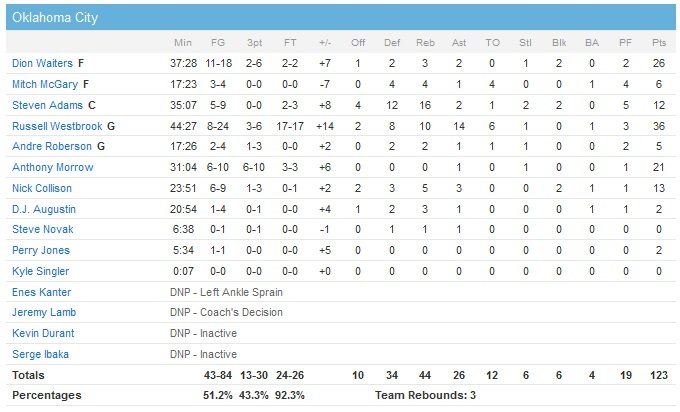 L’avance des Hawks s’accroît en début de troisième quart mais un 7-0 permet au Thunder de revenir à 81-76. Atlanta est toujours devant 95-90 pour entamer le quatrième quart. Et c’est là que tout bascule pour l’équipe de Mike Budenholzer. Morrow enchaîne deux 3-points pour réduire l’écart à 103-102 à 7 minutes de la fin puis Westbrook égalise à 3-points, 105-105. Sur la possession suivante d’OKC, Westbrook trouve Morrow pour son troisième 3-points du quart-temps et offre l’avantage au Thunder. Le shooteur plante encore un tir primé à 4 minutes du buzzer et les hommes de Scott Brooks resteront en contrôle jusqu’à ce que la sirène retentisse à la Chesapeake Energy Arena.