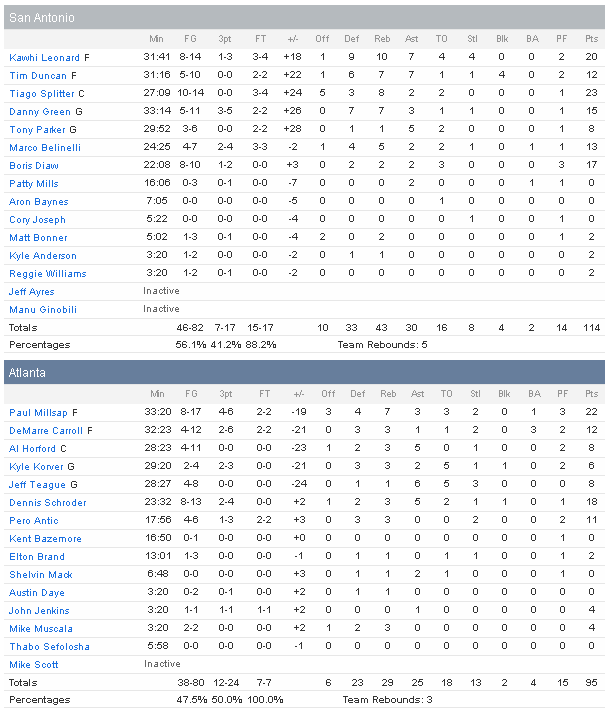 Le collectif des Spurs qu’il soit offensif ou défensif a fait la différence avec 6 joueurs à au moins 13 points. Tiago Splitter compile 23 points à 10/14 et 8 rebonds, Kawhi Leonard 20 points à 8/14, 10 rebonds et 7 passes, Tim Duncan 12 points, 7 rebonds et 7 passes. Boris Diaw ajoute 17 points à 8/10, Danny Green 15 et Marco Belinelli 13. Ils ont shooté à 56.1% contre 47.5 aux Hawks, qui ont surtout perdu 18 ballons. Paul Millsap a fait un bon match avec 22 points et 7 rebonds, tout comme Dennis Schröder en sortie de banc (18 points à 8/13)