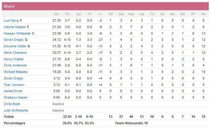 Malgré un bon passage du trio Dwyane Wade – Udonis Haslem et Luol Deng, Miami ne parvient pas à combler son retard et doit compter sur les exploits individuels tandis que Westbrook est toujours en mode caviar. Il offre ensuite 10 points d’avance à son équipe sur un 3-points en première intention après seulement 8 secondes de possession et le Thunder est devant 66-58 avant de jouer le dernier quart.