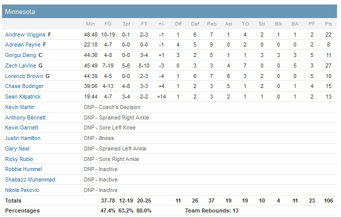 Les Timberwolves démarrent parfaitement leur prolongation par un 6-1 dont Utah ne parviendra pas à se remettre. Six des sept joueurs utilisés par Flip Saunders cette nuit ont inscrit au moins 10 points, alors que les rookies ont inscrit 66% des points de Minnesota. À noter qu’avec 12 matchs restants sur leur calendrier, les joueurs de Quin Snyder (qui a déclaré que l’équipe n’avait pas d’objectif particulier pour terminer la saison) ne sont pas encore éliminés de la course aux playoffs. Leurs chances restent minimes malgré un 12V-5D depuis le All-Star break.