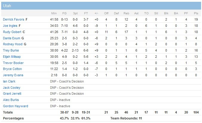Les Timberwolves démarrent parfaitement leur prolongation par un 6-1 dont Utah ne parviendra pas à se remettre. Six des sept joueurs utilisés par Flip Saunders cette nuit ont inscrit au moins 10 points, alors que les rookies ont inscrit 66% des points de Minnesota. À noter qu’avec 12 matchs restants sur leur calendrier, les joueurs de Quin Snyder (qui a déclaré que l’équipe n’avait pas d’objectif particulier pour terminer la saison) ne sont pas encore éliminés de la course aux playoffs. Leurs chances restent minimes malgré un 12V-5D depuis le All-Star break.
