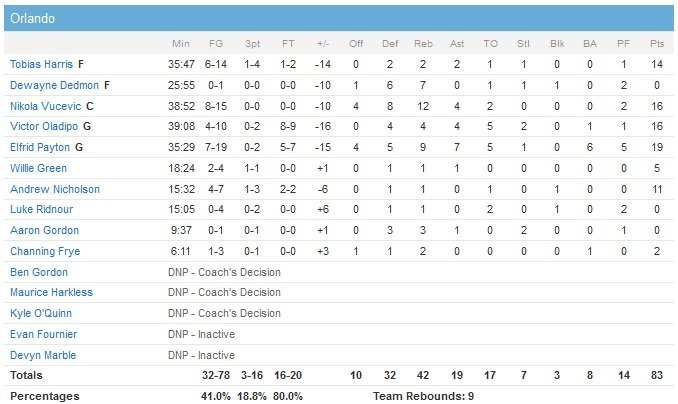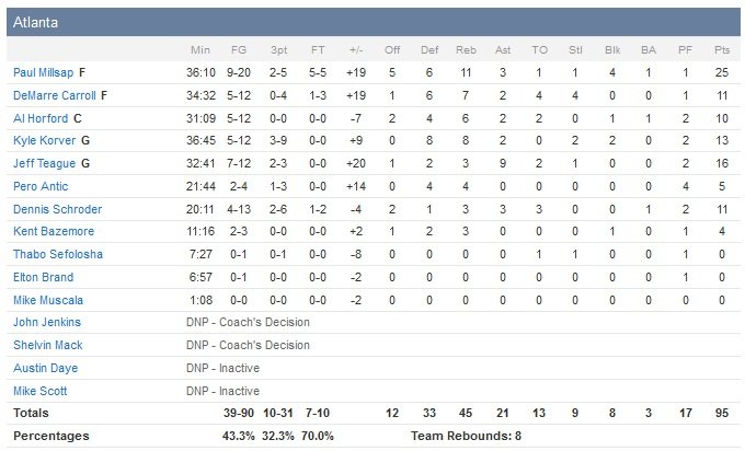 Encore devant 78-71 en début de dernier quart, le Magic (seulement 31 points inscrits en seconde mi-temps) se voit remonter 79-78 sur un floater de DeMarre Carroll à 5″42. Suite à un panier de Payton, les Hawks prennent une courte avance 82-81 sur deux layups signés Millsap et Teague. Les pertes de balles des locaux se multiplient et Atlanta prend le large 93-81 sur un 3-points de Teague à 1″55. À noter que Thabo Sefolosha a effectué son retour après 23 matchs d’absence (mollet). Le Suisse n’a joué que 7 minutes pour 0 point à 0/1 et 1 interception.