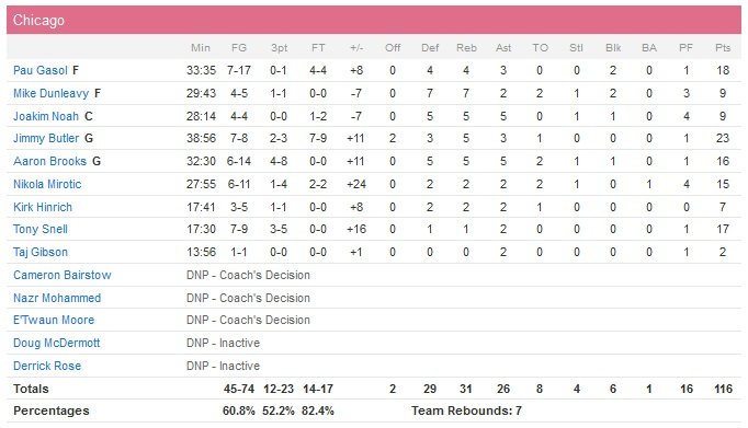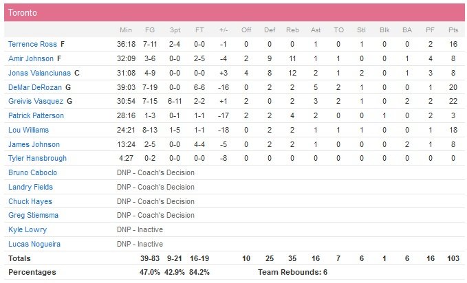 Tony Snell ajoute 17 points, Aaron Brooks 16 et Nikola Mirotic 15 pendant que leurs adversaires du jour s’inclinent pour la troisième fois en quatre matchs. Les Raptors n’ont plus gagné contre Chicago depuis le 31 décembre 2013. Pour son retour après un match de repos, Joakim Noah signe 9 points, 5 rebonds et 5 passes. Greivis Vasquez termine à 22 points (record en carrière avec six trois-points inscrits) en tant que remplaçant de Kyle Lowry, toujours souffrant du dos. DeMar DeRozan score lui 20 points. Terrence Ross prend les commandes du premier quart-temps avec 12 points alors que Vasquez plante 3 des 5 trois-points de son équipe, devant 29-20 après 12 minutes. C’est ensuite au tour de Brooks de prendre feu de loin avec 2 des 5 trois-points de Chicago dans le deuxième. Les hommes de Tom Thibodeau reviennent ainsi à quatre points, 54-50, à la mi-temps.
