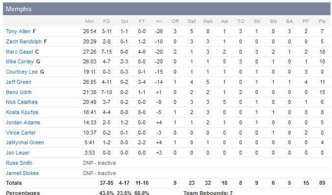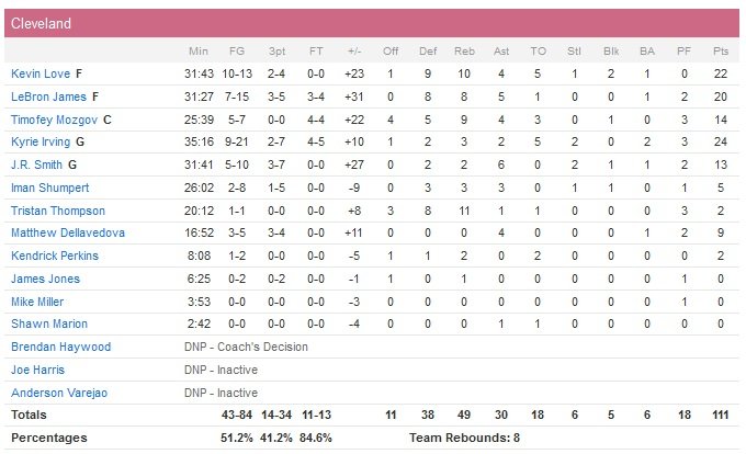 L’affiche promettait d’être plus disputée et pourtant, les Cavaliers n’y ont pas été par quatre chemins cette nuit avec une victoire 111-89 aux dépens des Grizlies. Kyrie Irving termine à 24 points (9/21), Kevin Love ajoute 22 points (10/13, 4 passes, 2 contres) et 10 rebonds alors que LeBron James se contente de 20 points à 7/15, 8 rebonds et 5 passes. Cleveland remporte ainsi une 4e victoire consécutive et un 8e succès en 9 rencontres.