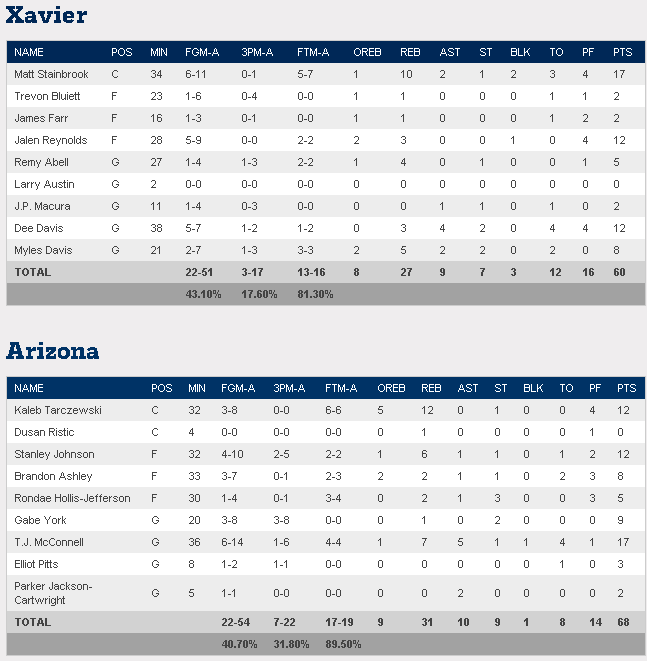 Les Wildcats d’Arizona accèdent eux aussi à l’Elite 8 en venant à bout de Xavier 68-60. Après 35 minutes d’un match très disputé Arizona a finalement fait la différence à l’aide d’un 15-4 dans le sillage de Kaleb Tarczewski (12 points et 12 rebonds) et T.J. McConnell (17 points, 7 rebonds et 5 passes).