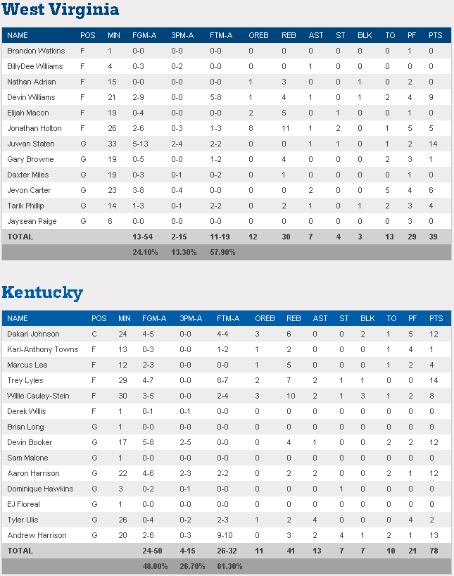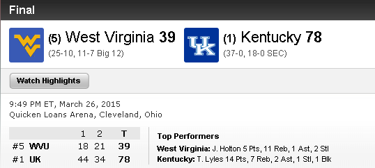 Hiérarchie respectée cette nuit pour le début du Sweet 16. Tout d’abord le grand favori Kentucky confirme son rang en massacrant littéralement West Virginia, qui n’a rien pu faire face à la défense de fer des Wildcats. Ils sont limités à 39 points, soit exactement la moitié des points inscrits par les hommes de John Calipari, menés par Trey Lyles (14 points et 7 rebonds), Devin Booker, Aaron Harrison et Dakari Johnson (12 points chacun).