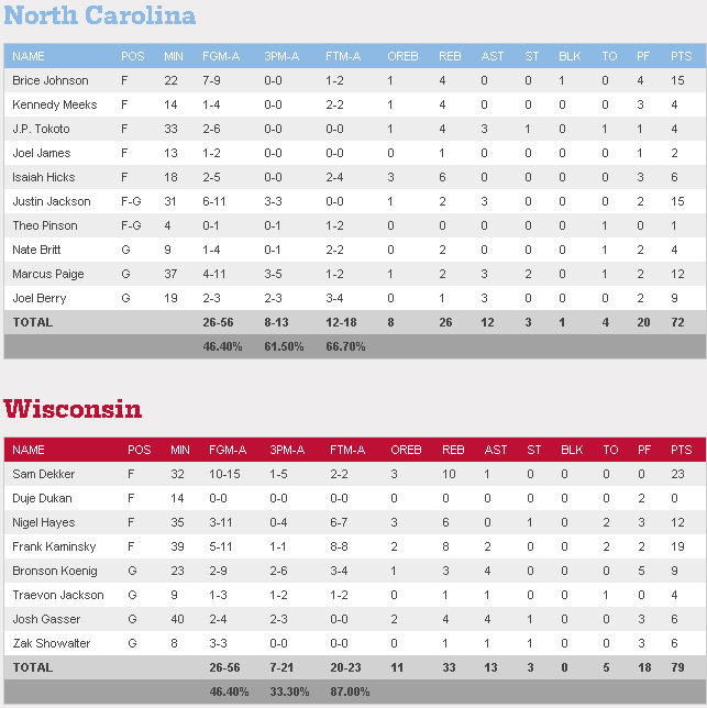 Dans l’affiche entre Wisconsin et North Carolina, le duo Sam Dekker et Frank Kaminsky a le dernier mot pour les Badgers qui s’imposent 79-72. Dekker a sorti le match de sa vie avec 23 points et 9 rebonds, Kamisnky 19 points et 8 rebonds et Zak Showalter marque lui 6 points dont 4 dans un 9-0 décisif qui a donné l’avantage 65-60 à Wisconsin à 5 minutes de la fin. Les Tar Heels ne sont plus jamais revenus à hauteur.